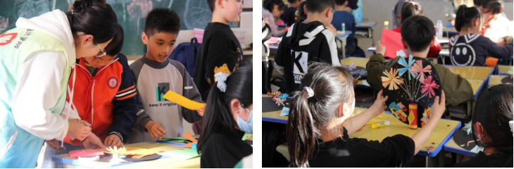 师生赴临潼区康复路小学继续开展每周一次的特色社团课程系列活动,本次课程的主题是“辞旧迎新,绽放异彩”。本次课程以燃放鞭炮的象征意义为主题,提升小学生们对禁燃烟花爆竹的认知,引导学生通过手工制作的形式来展现民俗活动,在本次课程中让他们更真切地了解和感受中国传统文化的魅力,从而激发小学生们对传统文化的兴趣和认同感。