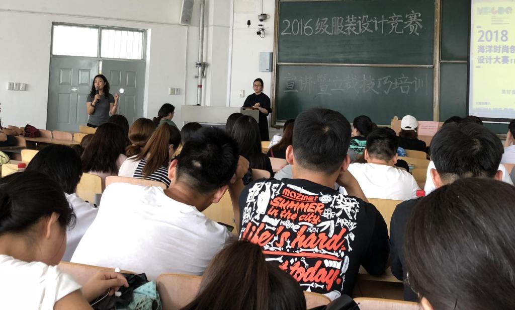 然后,孙洁进行服装设计竞赛宣讲,孙老师对2018海洋时尚创意设计大赛(服饰类)从大赛流程、票选环节、决赛和颁奖典礼等做了详细介绍,向同学们说明此次赛事的征稿要求、注册要求、大赛报名注意事项、大赛的规模和设计成果。