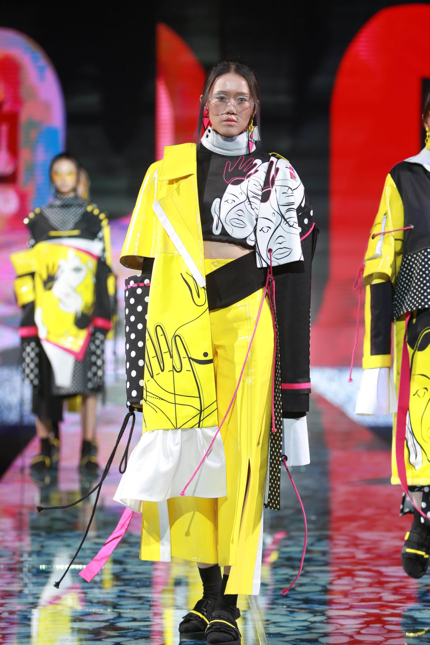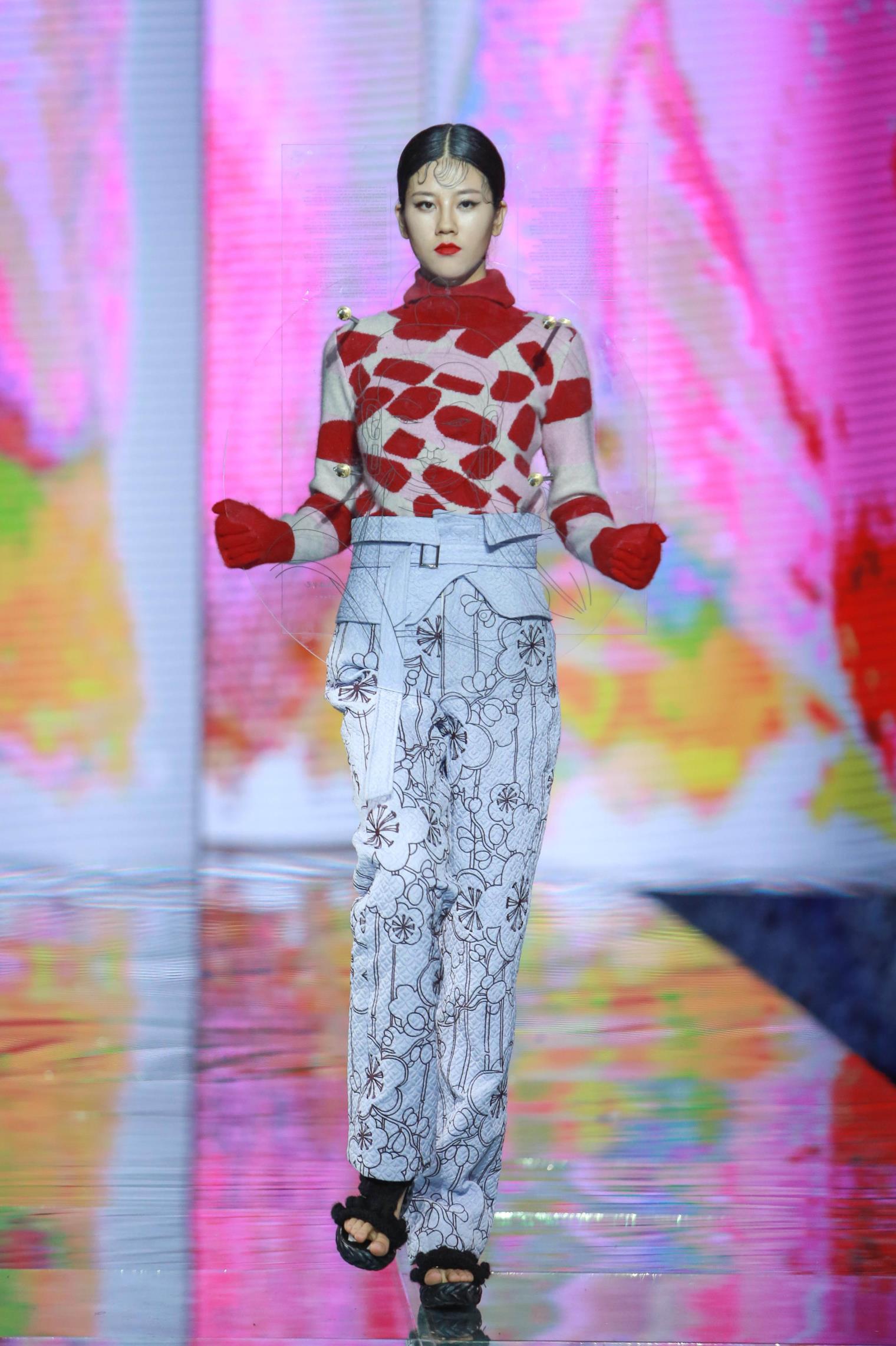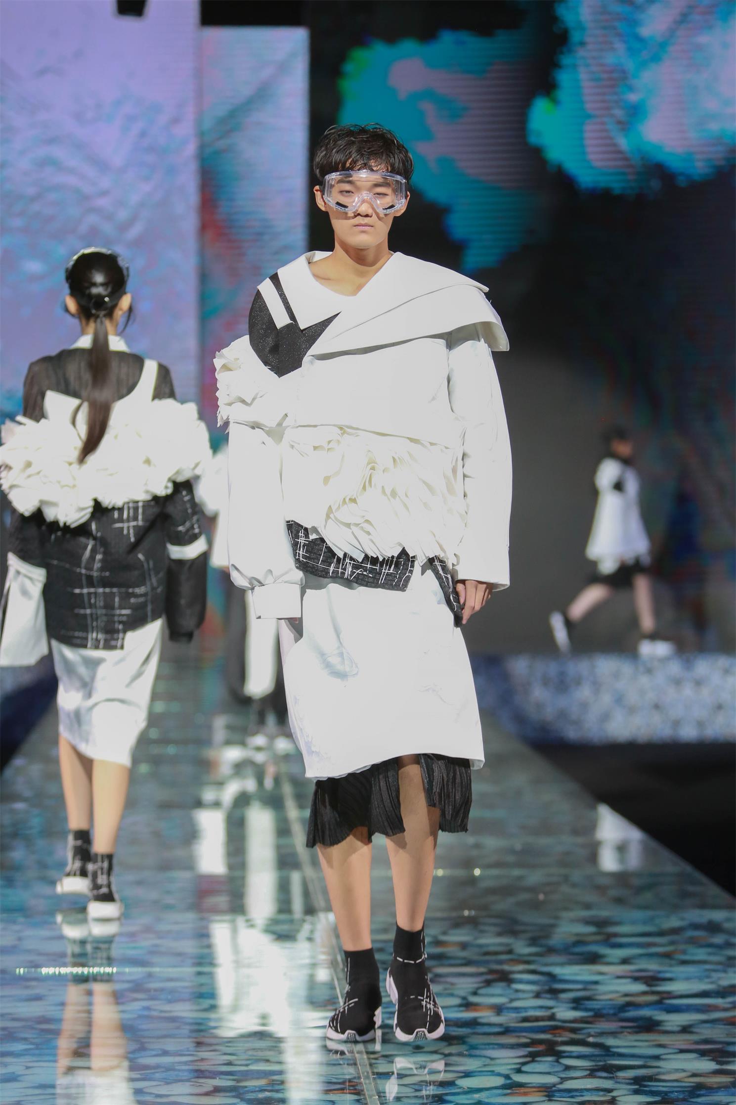 参加本次大赛的毕业设计作品主要是从服装与服饰设计专业(含时装设计方向、针织服装艺术设计方向、时尚形象与陈列方向及卓越设计师计划班)近300多个系列中精选出来的,分为动态展和静态展两部分,动态展作品27个系列、近160套优秀的系列设计作品,静态展作品有17个系列、36套服装。与往年相比,本次的作品发布的独特之处在于——希望年轻人停下疾驰的脚步、驻足停留,从“汉”文化的视角切入,慢慢体会和思考西安作为十三朝古都的文化底蕴与内涵,强调对中国传统服饰文化的挖掘与研究。毕业设计作品中,除了强调西方服饰结构的立体块面,同时还通过服饰结构的披挂缠裹、手绘的写意水墨画、手工刺绣装饰等,强调出对东方传统文化的尊重与继承。当然,在年轻设计师的手中,所有这些又和迥异的材质对比、强烈的色彩碰撞、夸张的体量对比相融合,代表了新生势力、新锐视角的全新诠释。此外,今年的毕业设计作品中,男装系列的数量和比例也较往年大幅增加。