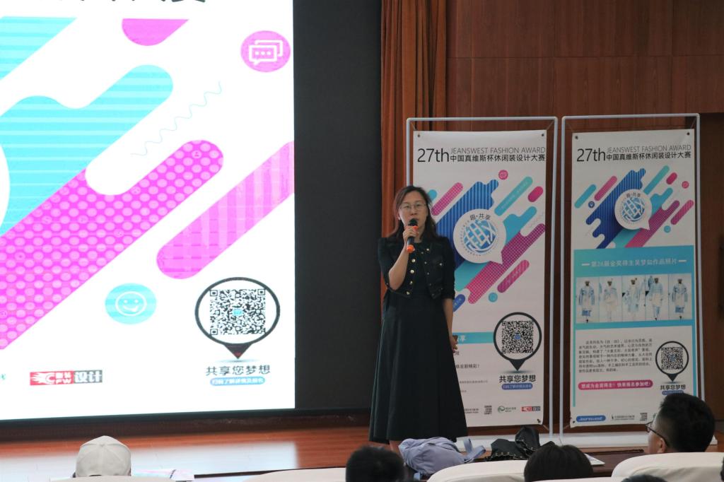 接着,真维斯集团代表赵西娜通过大赛简介、赛程安排、主题介绍、第26届精彩回顾等方面对中国真维斯杯休闲装设计大赛进行了详细的讲解与介绍。她表示,学生应该多多参与此类赛事,从中锻炼自己的各种能力,提升专业素养,并且还可以结实一些高水平的评委老师与参赛选手。讲解期间,她还将第26届大赛西部地区一等奖以及三等奖作品以动态时装秀的形式向大家展示,使学生们对本次大赛有了更深的了解与想法。