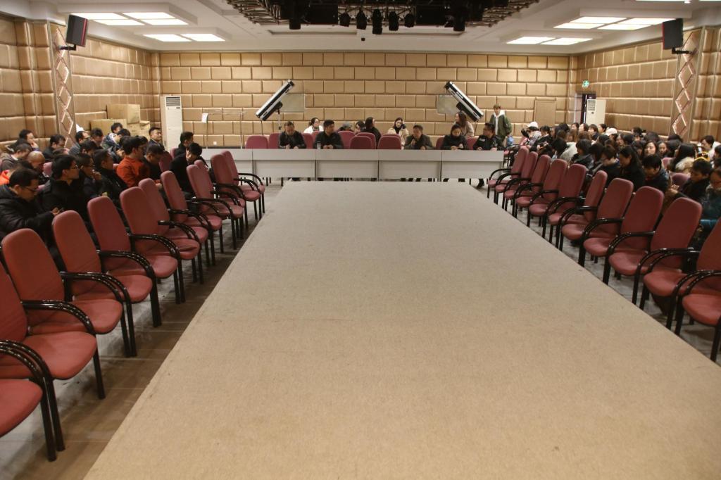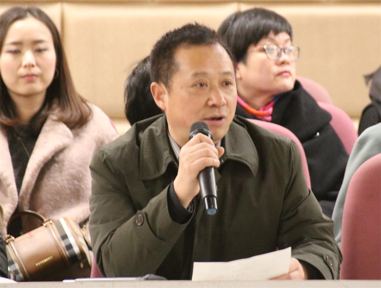 在金花校区学院一楼多功能厅召开全院教职工大会。学院党委书记李筱胜,副院长吕钊、田宝华,学院办公室主任周芸,全院教工共一百余人到会参加。大会由李筱胜书记主持。