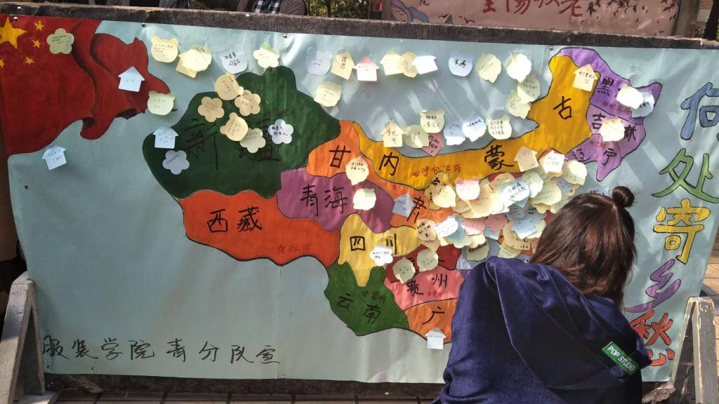 经过上午的精心布置,中午11:50活动准时开始。在青分队各位部长的领导下,干事们分工明确,井井有条,介绍宣传、分发礼品、后台后勤都有条不紊地进行。为调动现场同学们的积极性,青分队还设置了“扫码、答题、写寄语、赢礼品”的小游戏,这让现场气氛十分活跃,同学们在答题和写思乡寄语的同时,也获得了知识和喜悦。活动持续到下午1:20,青分队所有成员集合拍团体照片,此次活动圆满结束。