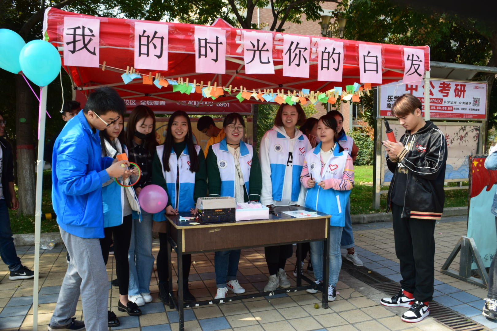 于10月27日中午,重阳节到来前夕,在临潼校区中心广场开展了以“我的时光,你的白发”为主题的爱校日宣传活动。本次活动由澳门新葡京