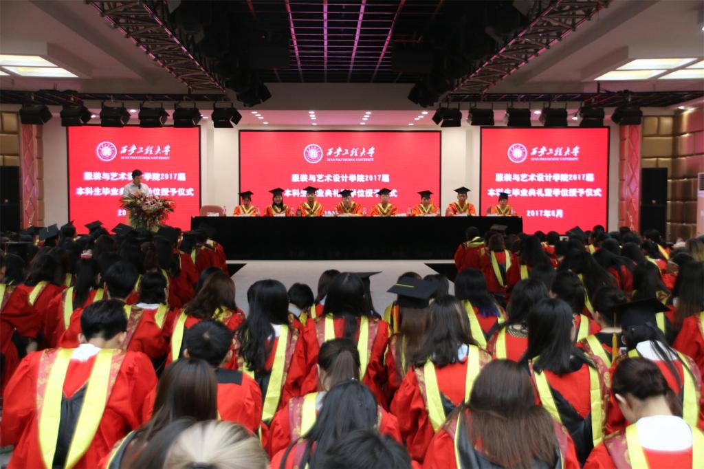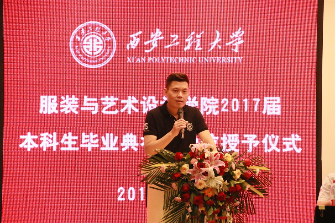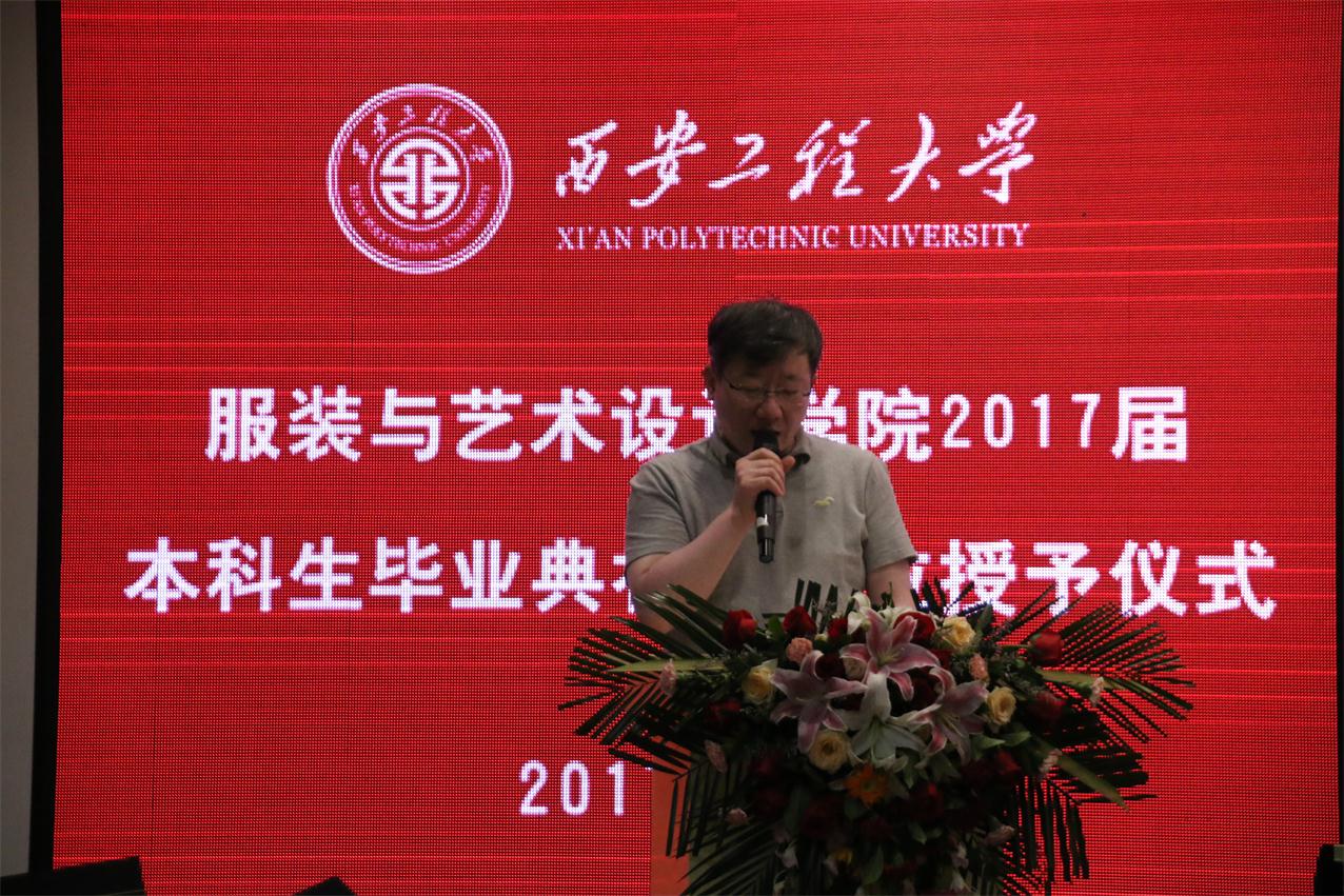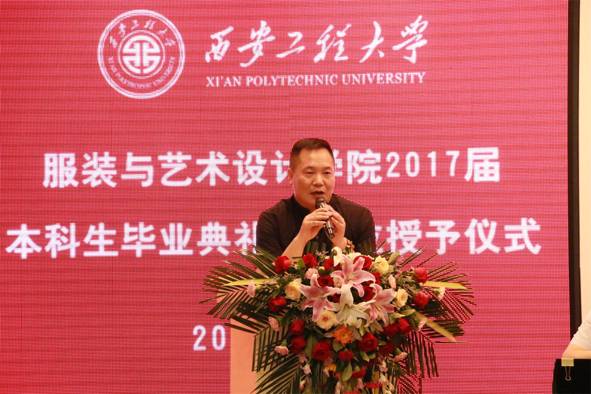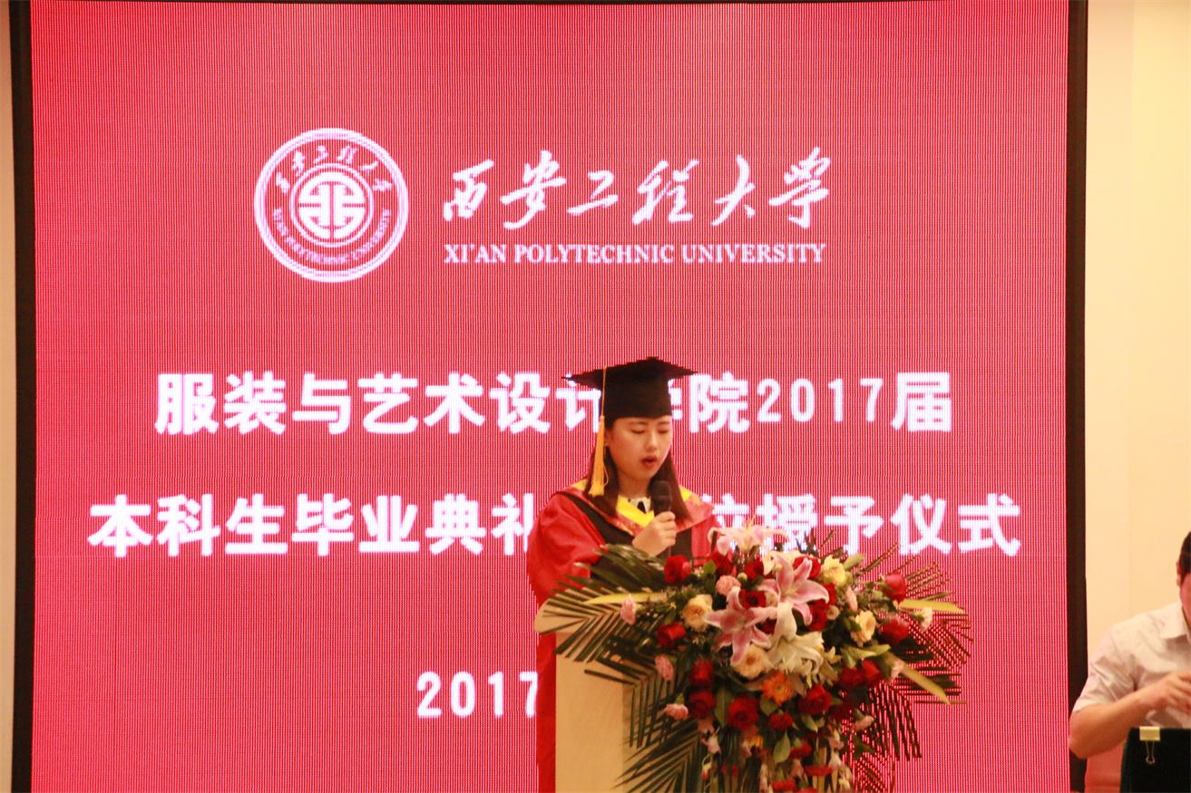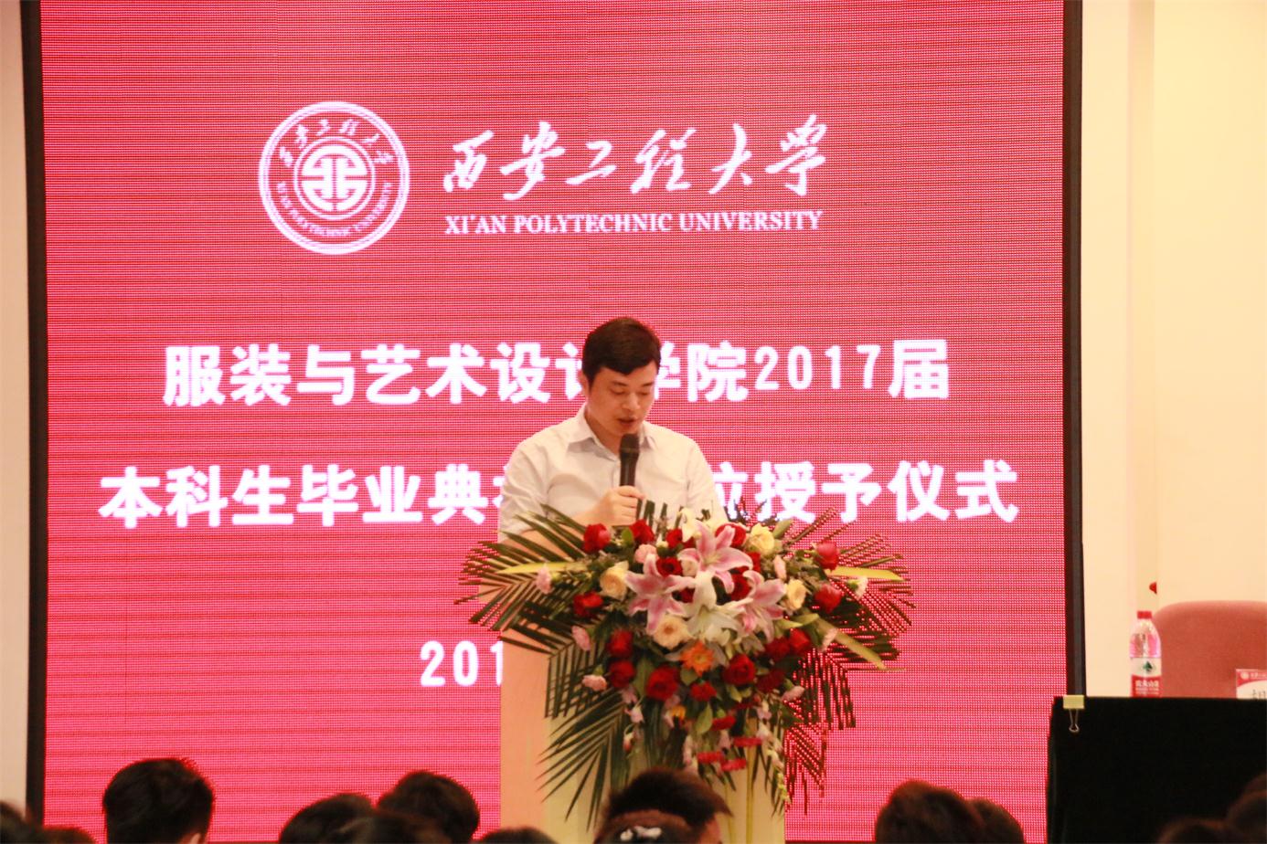 毕业典礼在庄严的国歌中正式拉开帷幕。首先,戴鸿代表学院致辞。向全体毕业生顺利完成大学学业表示热烈祝贺,并向全体毕业生提出了几点建议:一是希望同学们学会做人,做好人;二是希望同学们学会做事,做好事;三是希望同学们情系学院,心怀感恩。希望同学们无论今后身在何方,身居何职,都要将“负重奋进,实业报国”的精神牢记心中,将自己今生永恒的身份——西安工程大学服院人铭刻在心里,并欢迎大家常回来看看,学院会始终关注大家的成长、支持大家的事业,学院永远是同学们人生旅途中的坚强后盾和精神家园。