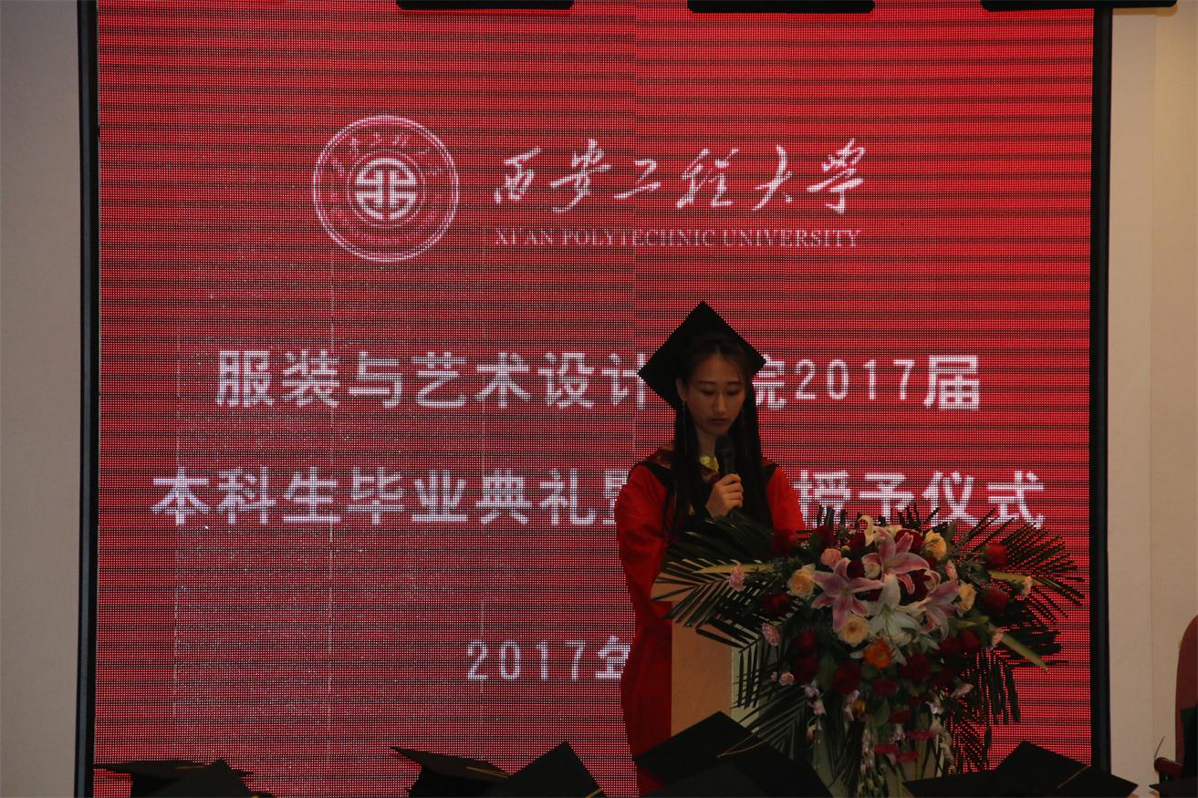 优秀毕业生代表服装表演专业任子瑜、产品设计专业孙伟一、环境设计专业王丹青分别发言,他们代表全体毕业生对所有老师在大学四年里的辛勤培育表示衷心的感谢,并表示今后一定会不负老师嘱托,继续在各自的岗位上认真学习、努力工作,成就精彩人生,用成绩向学院汇报。