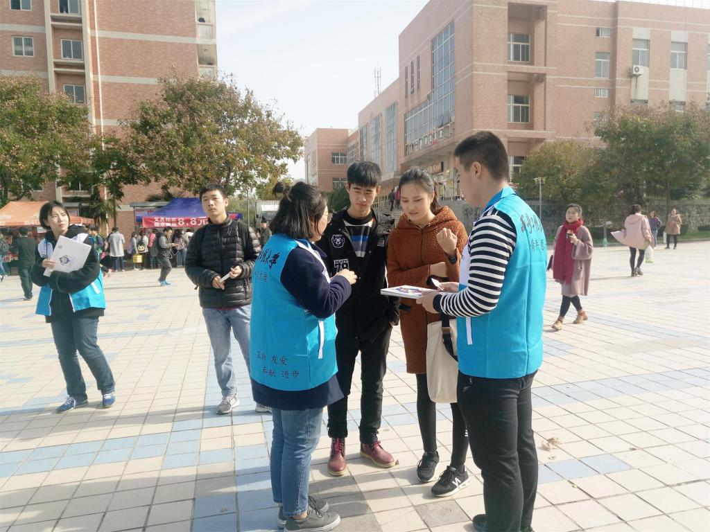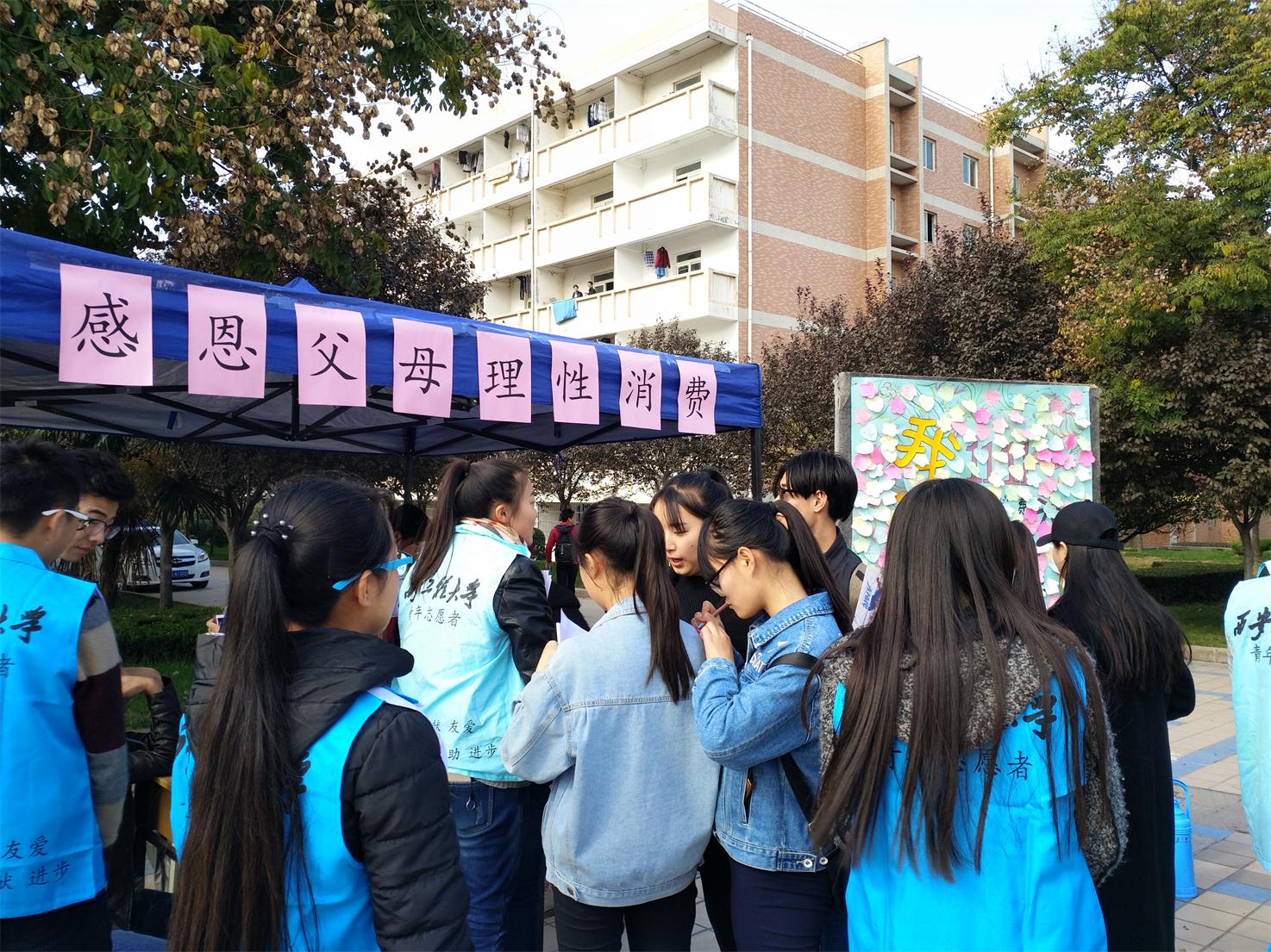 学生会青分队举行了十一月份爱校日活动。此次爱校日志愿活动以“懂得感恩,理性消费”为主题,旨在提醒我校广大大学子理性消费的同时也唤起同学们的一颗感恩之心。