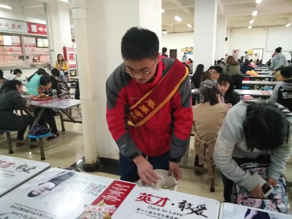 为更好增强同学们文明就餐意识,创造良好的就餐环境,体现志愿者的义务服务性。西安工程大学服装与艺术学院于2016年10月24日至28日在青分队部长李存正、于思含及牛玉宁的组织下,展开为期一周的食堂执勤志愿活动。参与人员有青分队全体成员以及70名志愿者。