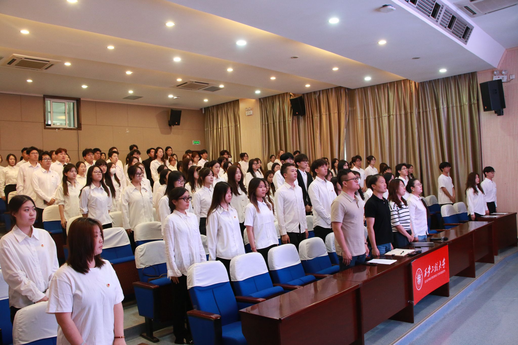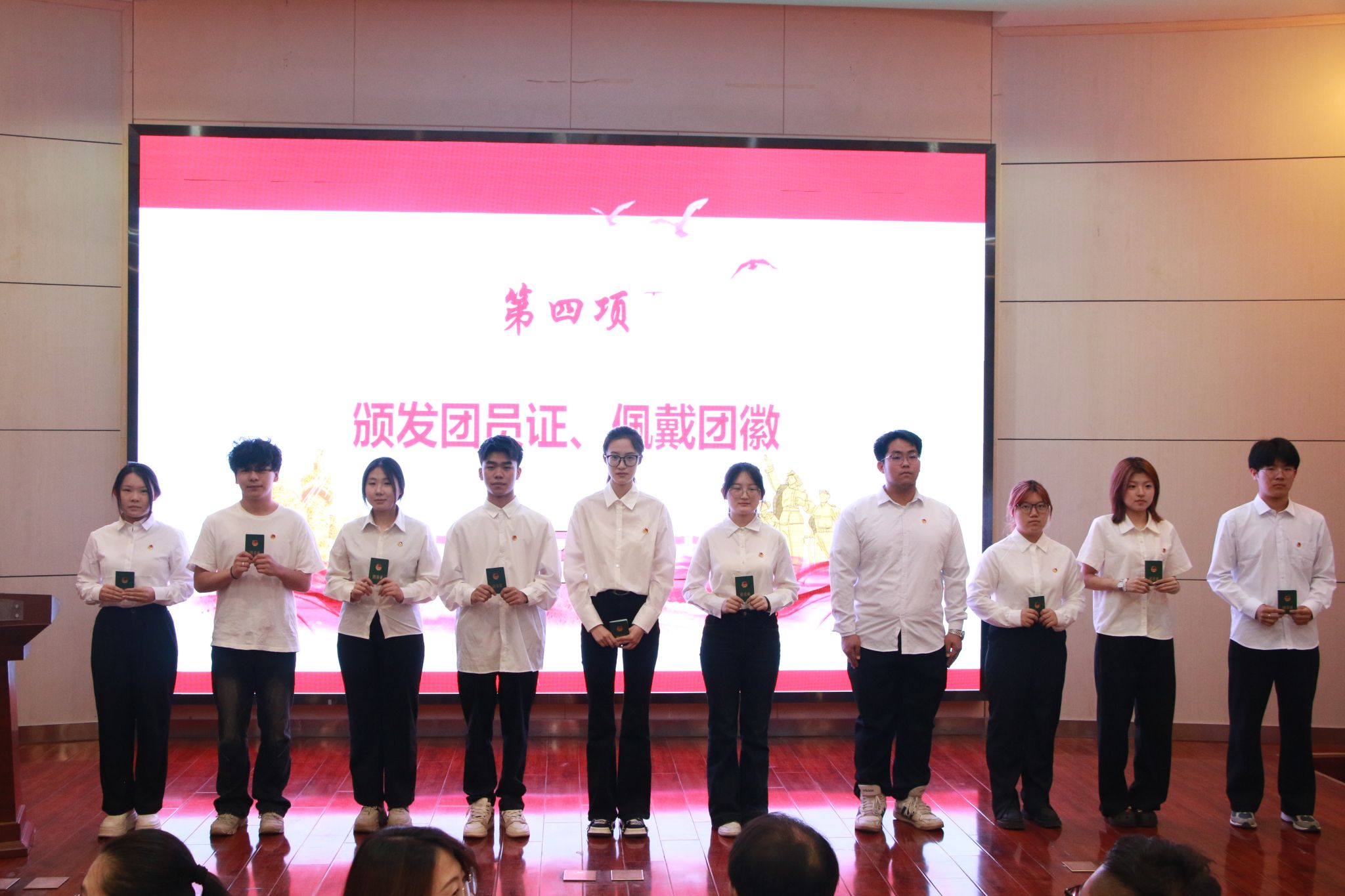 活动在激昂的国歌声中拉开帷幕,全体师生肃立齐唱,激荡起爱国热情。主持人宣读新团员名单后,老团员们为新团员颁发团员证、佩戴团徽。经过严格培养考察的123名新团员在老团员见证下,由团委副书记孙晨倩带领,面向团旗庄严宣誓。入团介绍人李尚谦详细宣读了团员的义务与权利,强调“权利与责任并重,荣誉与使命同行”。新团员代表童予发言,承诺将牢记誓言,以行动践行团员使命;优秀团员代表周德云结合自身四年团学经历,分享了“服务、成长、奉献”的深刻感悟,激励新团员在集体中实现价值。