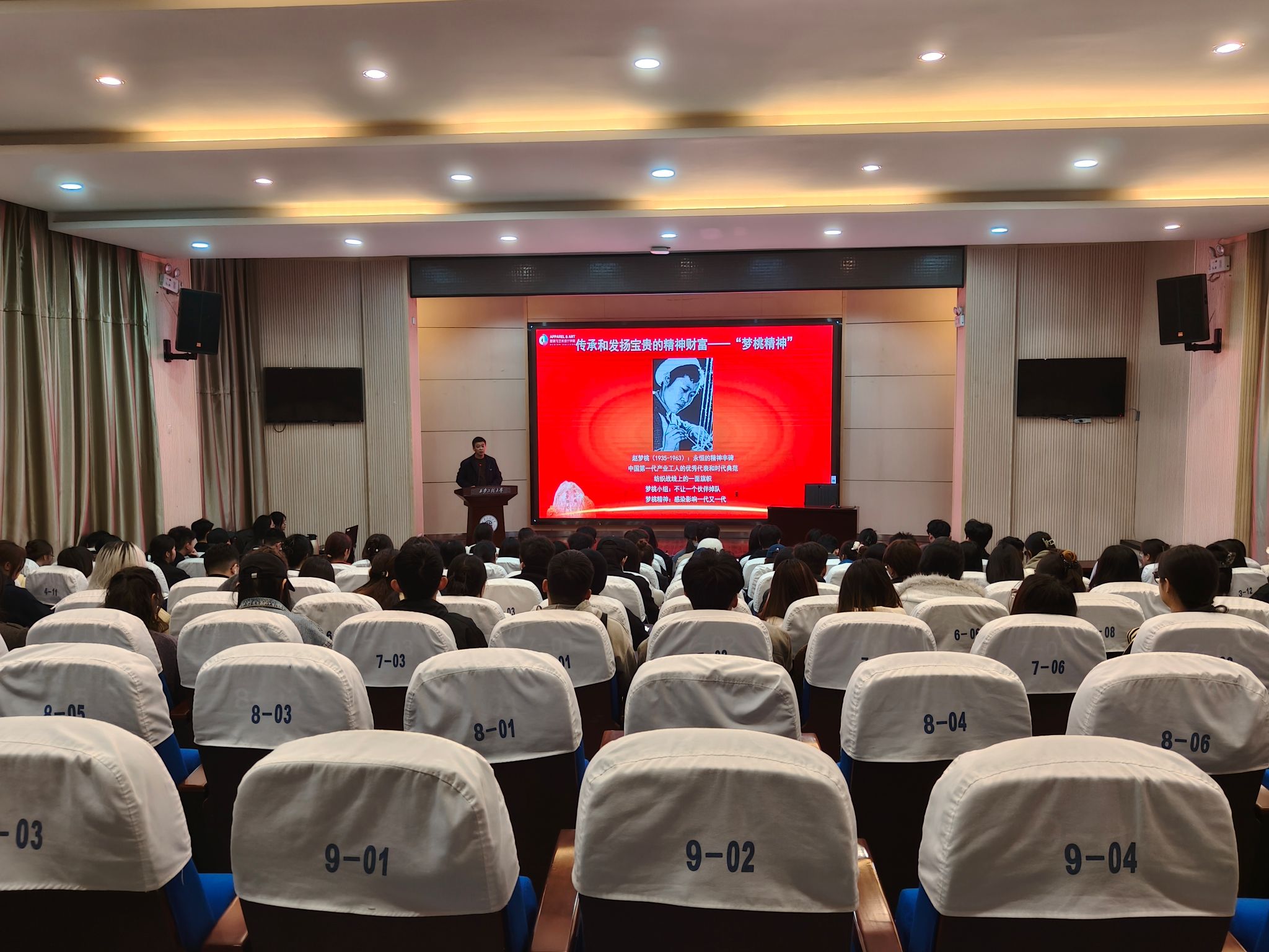 党委开展“赓续梦桃精神勇担时代使命”主题党课,服工系教工党支部书记任军、全国大学生自强之星谢林分别担任主讲人。