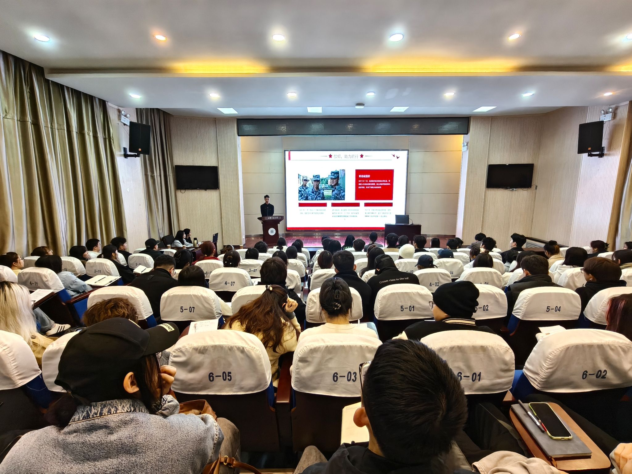 谢林结合自身军旅生涯与学生经历,分享了在军营中锤炼意志、退役后重返校园攻克生活与学业难题、带领团队斩获设计类竞赛奖项的奋斗故事,真挚表达了“军营教会我坚韧,党徽指引我前行”的心声,并与在场学生共勉,立志争做有理想、敢担当、能吃苦、肯奋斗的新时代好青年。