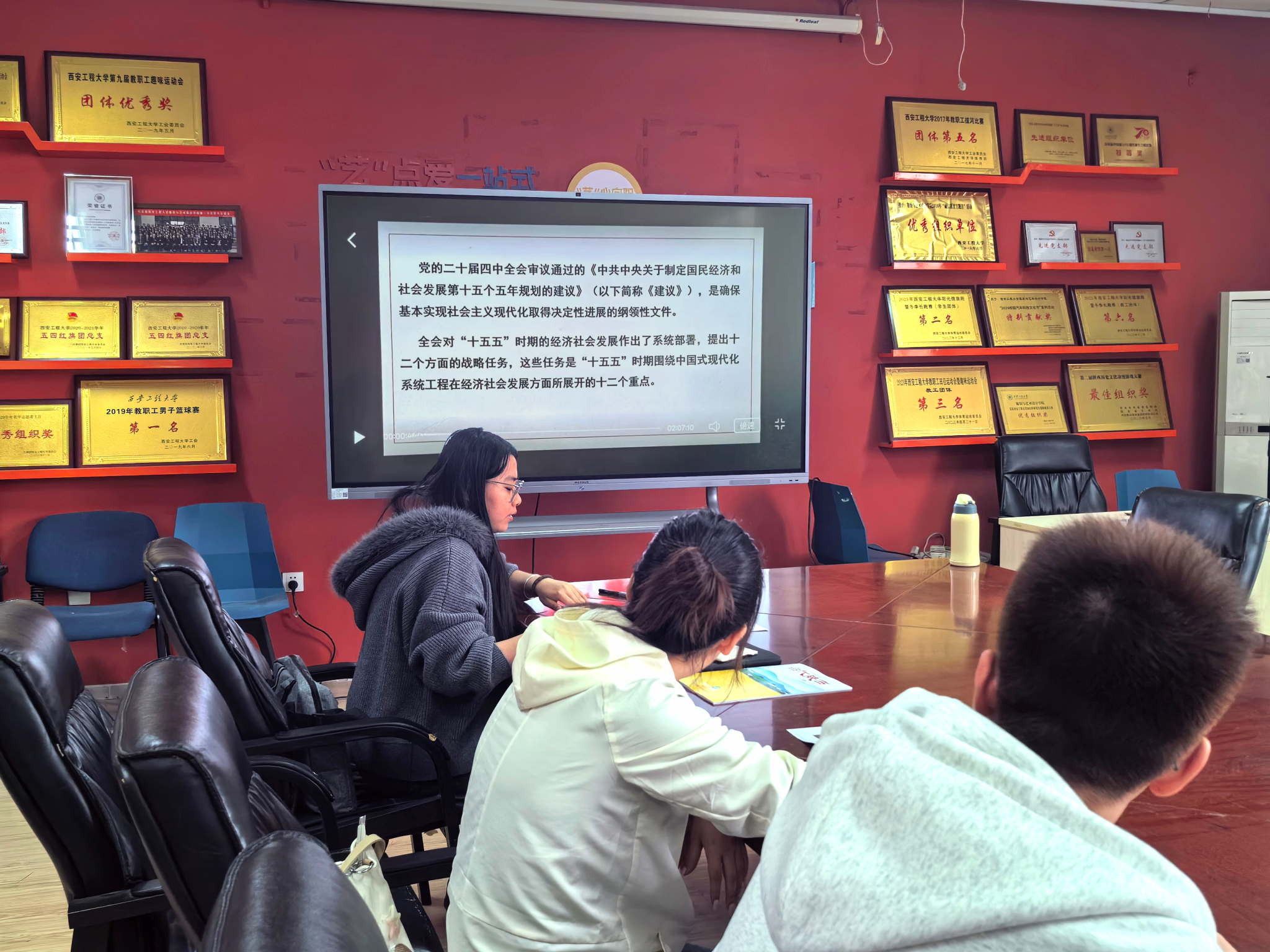 4月8日,支部在学院党团活动室进行集体学习,深入学习贯彻党的二十届四中全会精神。支部书记马薏雯老师参会指导,支部全体党员参加。会上,马薏雯首先作学习动员,要求全体学生党员深刻领会“十五五”时期经济社会发展的指导思想、重大战略任务,切实增强责任感和使命感。