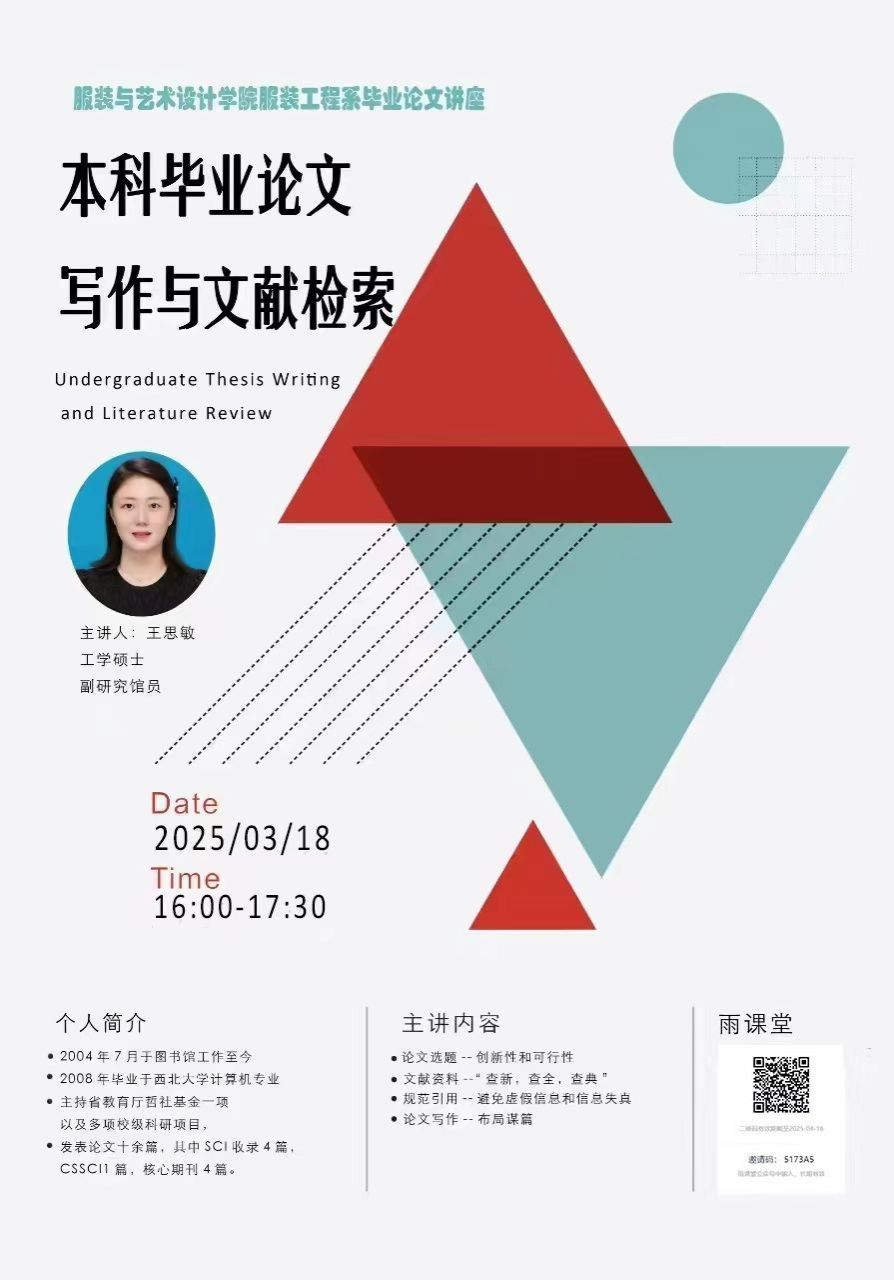 服装工程系依托在线教学平台 "雨课堂",为 2021 级服装设计与工程专业全体毕业生带来了一场题为《文献检索和学术规范》的专题培训。本次活动特邀校图书馆王思敏老师担任主讲,系统指导学生构建科学的学术研究方法论。