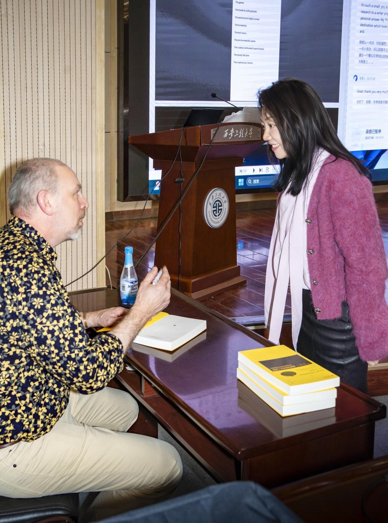 讲座尾声,现场5位师生代表围绕传统手工艺的创新转化、AI时代的设计伦理等议题与教授展开了深入且热烈的问答互动。活动最后,德拉津教授还举行了签名赠书活动,与在场师生亲切交流,现场学术氛围浓厚。
