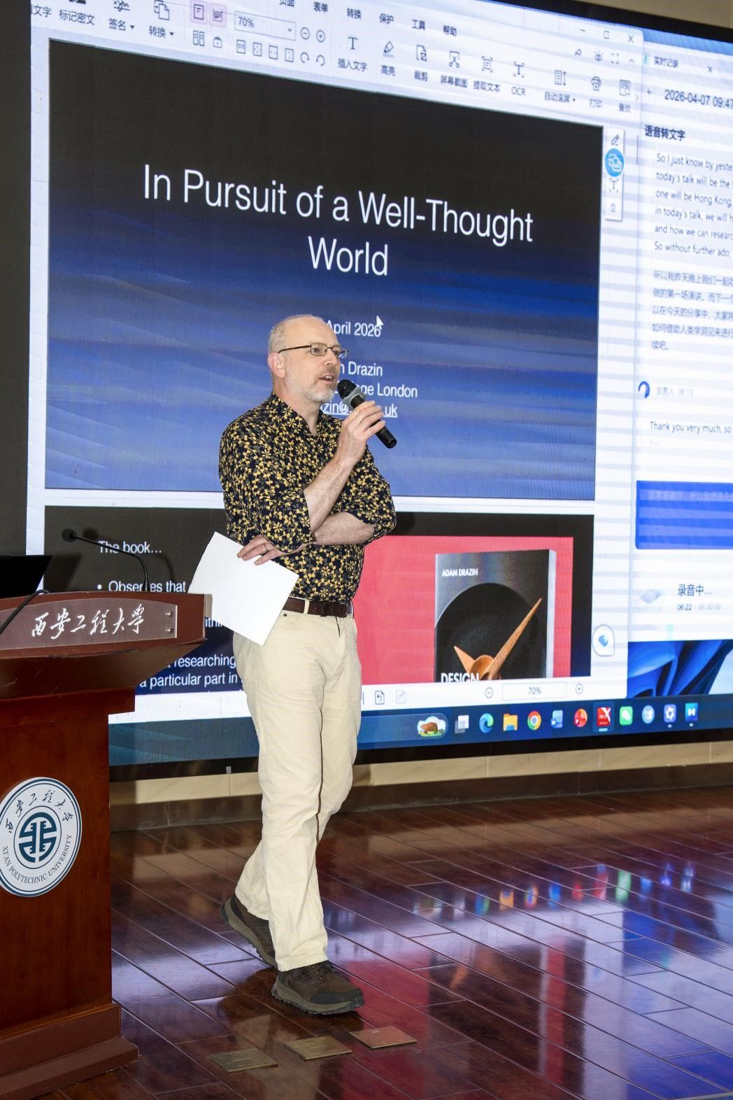 2026年4月7日,由西安工程大学服装与艺术学院、西安工程大学-英国德蒙福特大学中外合作办学项目联合主办的“迈向深思熟虑的世界:语境中的设计人类学”国际学术讲座成功举行。本次讲座特邀UCL人类学院教授、博导、设计人类学资深专家亚当·德拉津(Adam Drazin)担任主讲。作为国际物质文化顶刊《Journal of Material Culture》编辑主任及AHCI期刊《Home Cultures》主编,德拉津教授为我校师生带来了一场关于设计人类学前沿理论与实践的学术盛宴。此外,列席嘉宾还有爱尔兰梅努斯大学(Maynooth University)人类学教授Pauline Garvey,、天津美术学院讲师时典博士。
